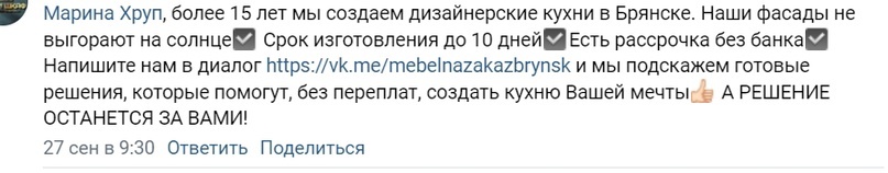 • в первую очередь написала скрипт для чат-бота. он автоматически отправлял каталог работ, по таймеру через несколько дней делал рассылки с контентом о выборе кухонь. В нем по триггерному слову можно было оставить заявку на расчет стоимости и заполнить заявку на замер. Все это без траты времени менеджера на однообразные вопросы и ответы. Все это забрал на себя бот. Согласитесь, удобно?